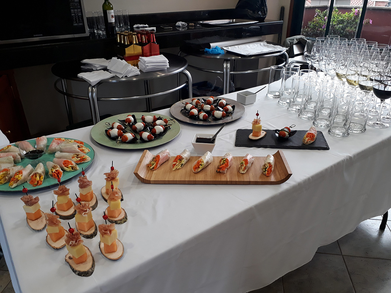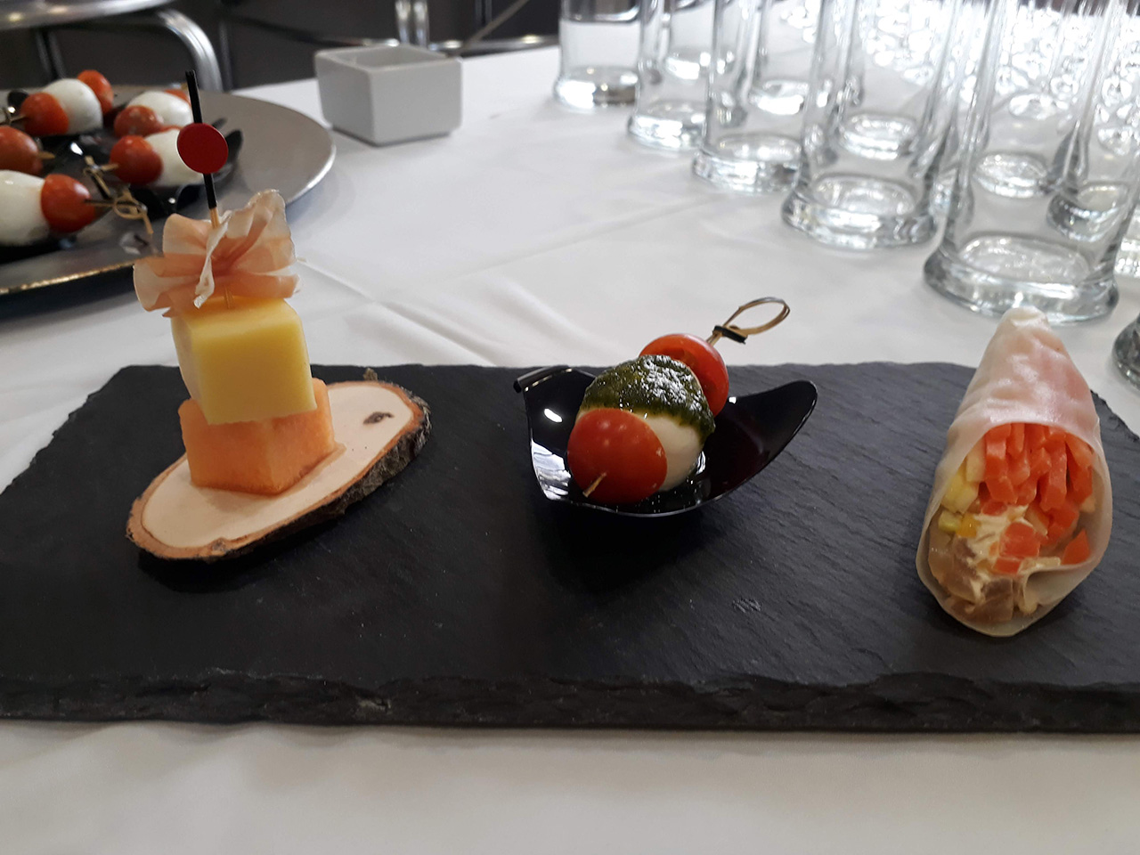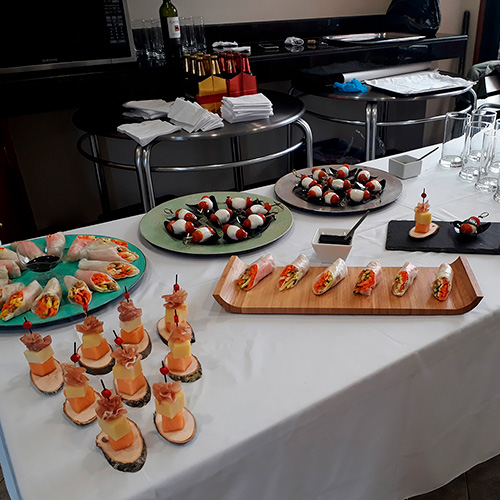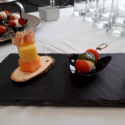 PasabocasBrocheta de queso, jamón serrano y pepino.