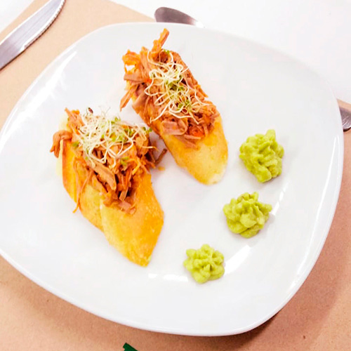 PasabocasMontadito de tocineta, jamón y brotes frescos.