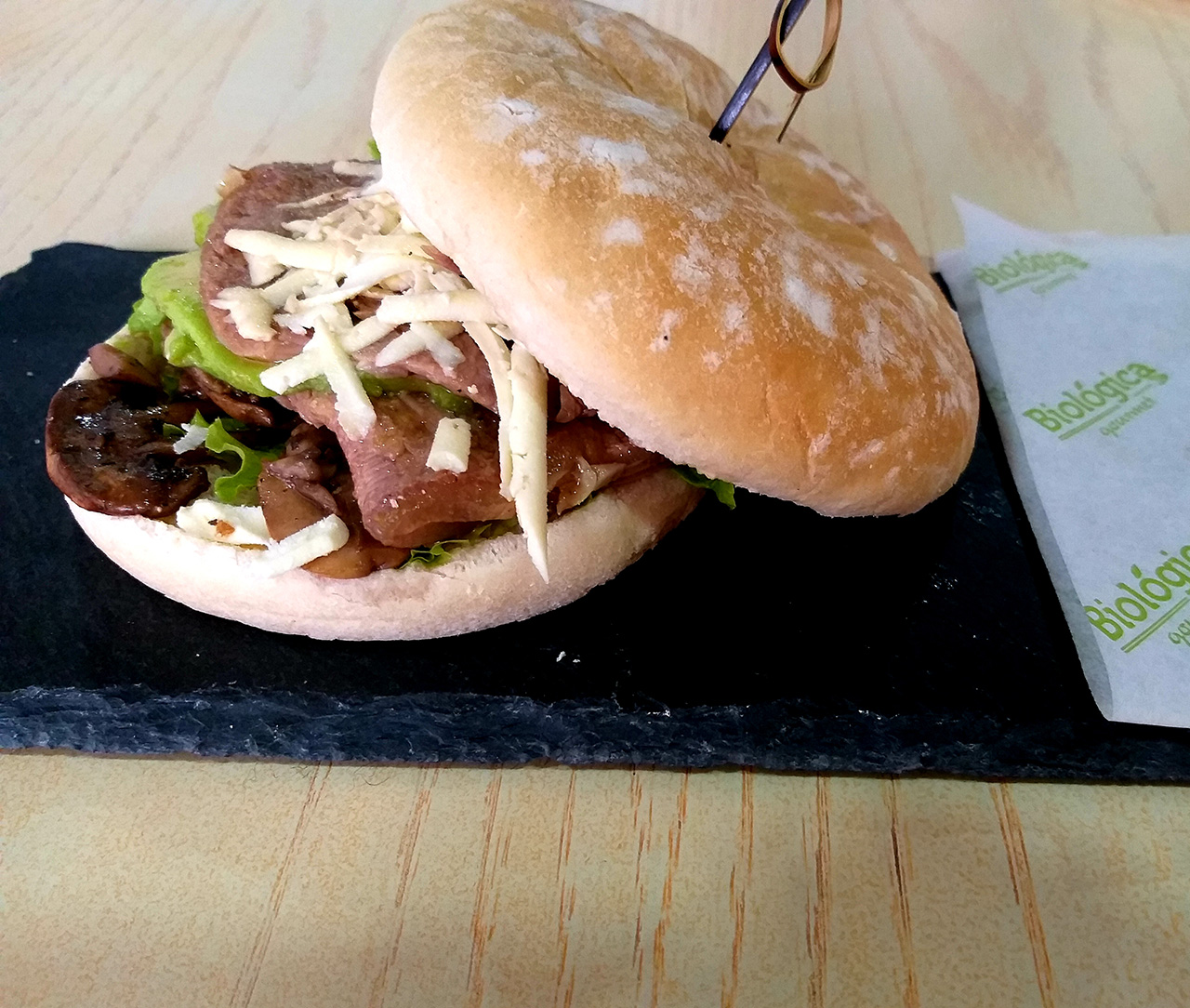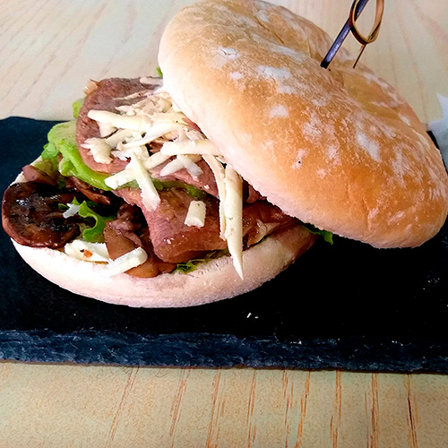 RefrigerioSándwich de Roast beef con queso costeño y champiñones y jugo natural.