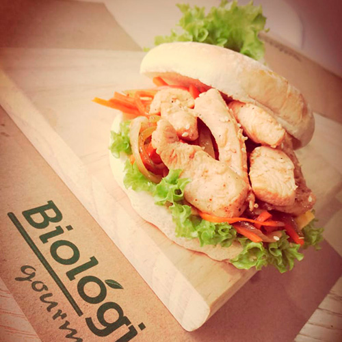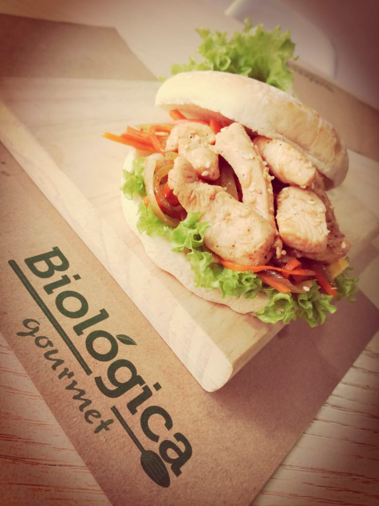 RefrigerioPan pita relleno de pollo crocante, rúgula y cebolla caramelizada con jugo natural.