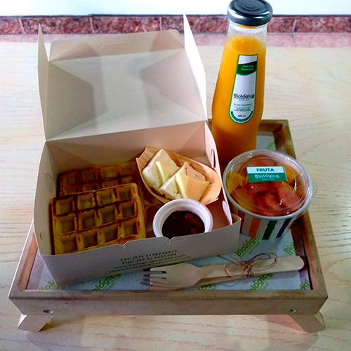 RefrigerioWaffles con mermelada natural, quesos, porción de fruta y jugo o avena.