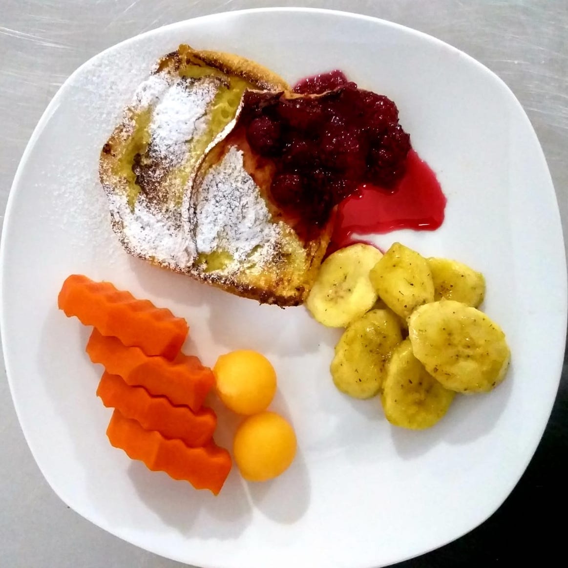DesayunoTajadas de pan doradas con dulce de mora y bananos en mantequilla flameados con brandy, acompañado con porción de fruta y bebida.