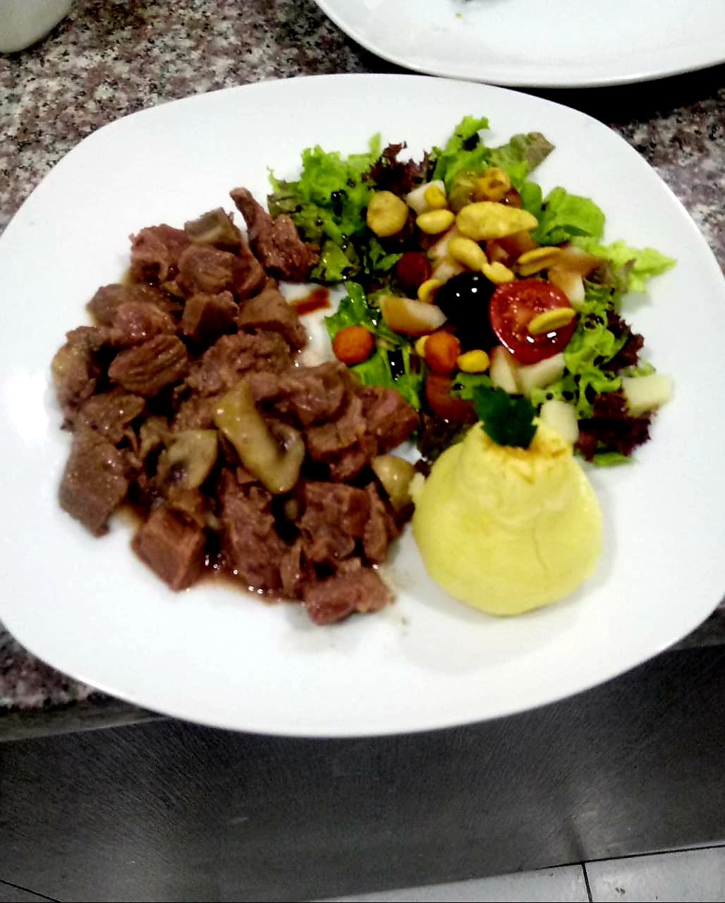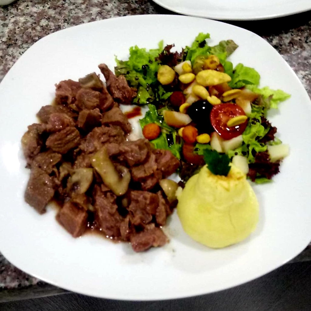 DesayunoEnsalada de pollo, papa y manzana.